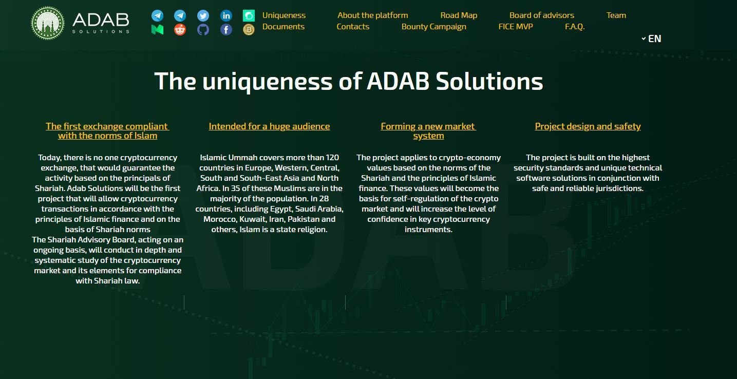 ADAB Solutions is a new cryptocurrency project that focuses on these countries and their inhabitants. This is the first cryptocurrency platform, whose actions do not conflict with Sharia law. The main objective of this project is to reconcile cryptocurrency assets and high moral and cultural values of Islamic countries. All this must lead to the creation of a global cryptocurrency platform for Muslims and the whole world.