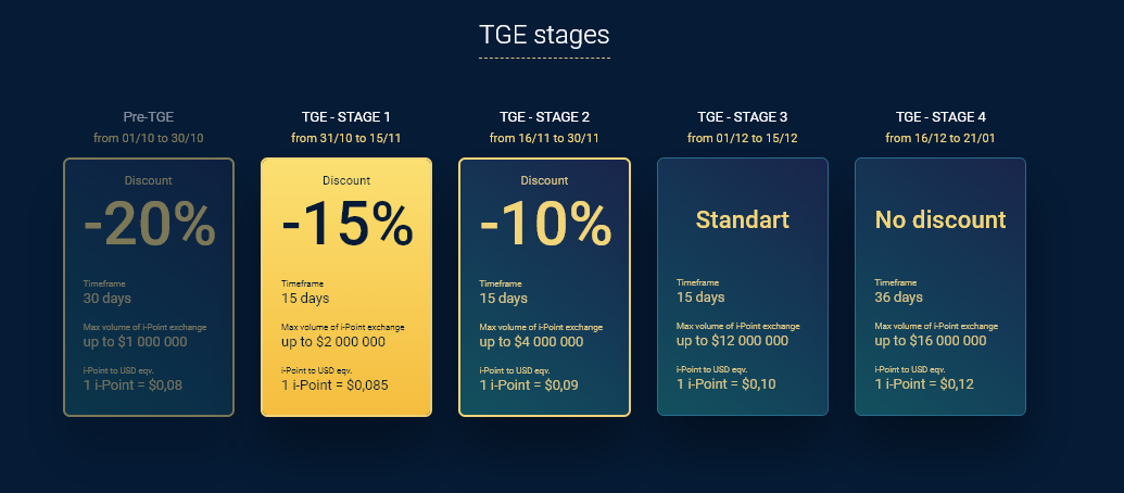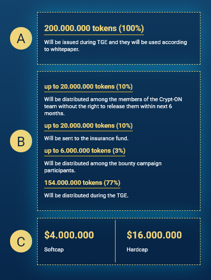 I-Point is the main token of the Crypt-ON project and it is nothing but a digital token created on the Ethereum basis. The release and sale of the token is going to be carried out within TGE (Token Generation Event).