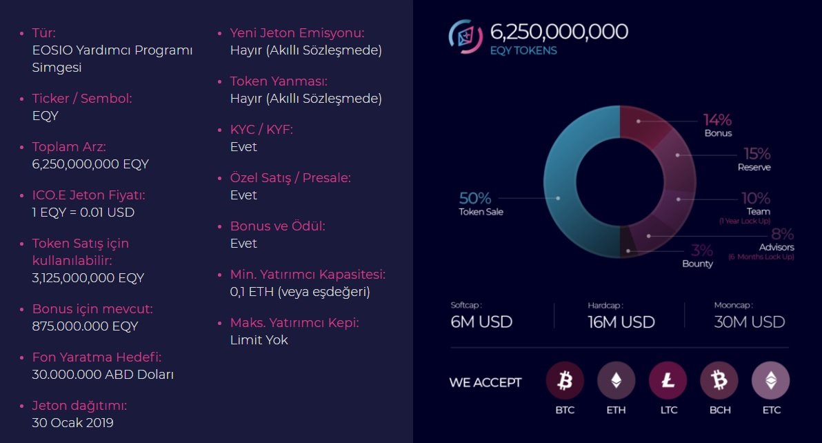 Чтобы профинансировать развитие экосистемы Eqwity, публика предлагает возможность продажи токенов EQY 8 ноября 2018 года с 1 EQY = 0,01 доллара США и ценой доступных токенов. для монетных продаж 3 250 000 000 EQY. Для получения подробной информации о токенах, пожалуйста, посетите eqwity.io и вступительный отчет https://bit.ly/2C59Dbr